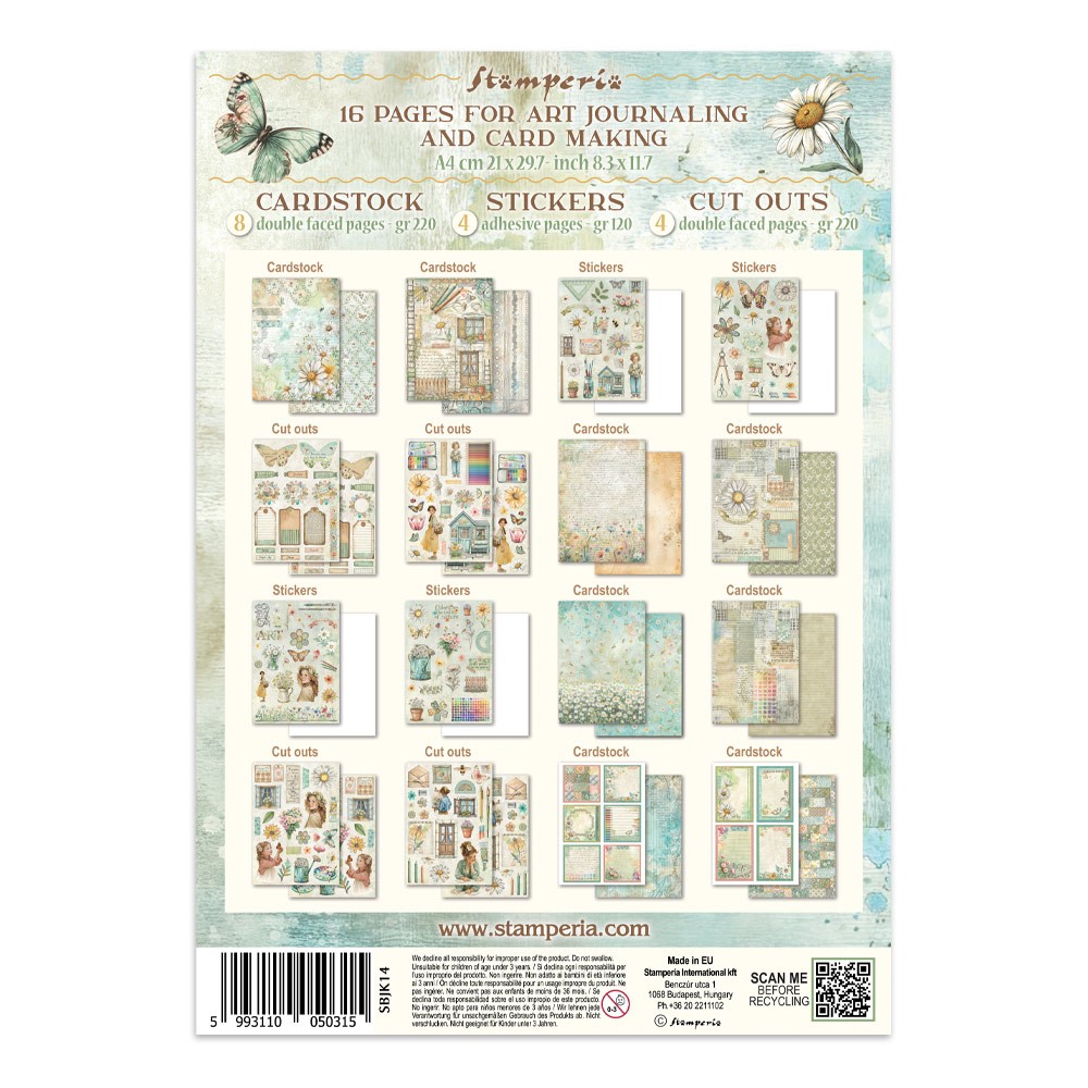 Le Junk Journal comprend 16 pages pour l'art journaling et la création de cartes. Vous y trouverez : 8 pages double face, du papier cartonné (220 g), 4 pages adhésives, des autocollants (120 g), 4 pages double face, des découpes (220 g).